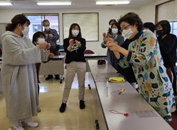 | 令和2年度 マダン活動報告 令和2年11月28日(土) 会場:愛媛県国際交流センター 2F 会議室 愛媛県国際交流員の李有美(イ·ユミさんを講師に迎え、韓国の組み紐メドゥブを作りました。 メドゥブの紐は18色あってどれにしようか迷いました。 事前にメドゥブ作りの動画を見て予習しましたが、実際に作ると「ん?」「こうかな?」「あれ?」の連続で(笑) でも次第にみんなで協力してひとりで作れるようになりました。 慣れると個性が出て、出来上がった作品を並べて撮影タイム!? 村上新会長さんも参加されて楽しい交流会でした。 (運営部:Y.I) |